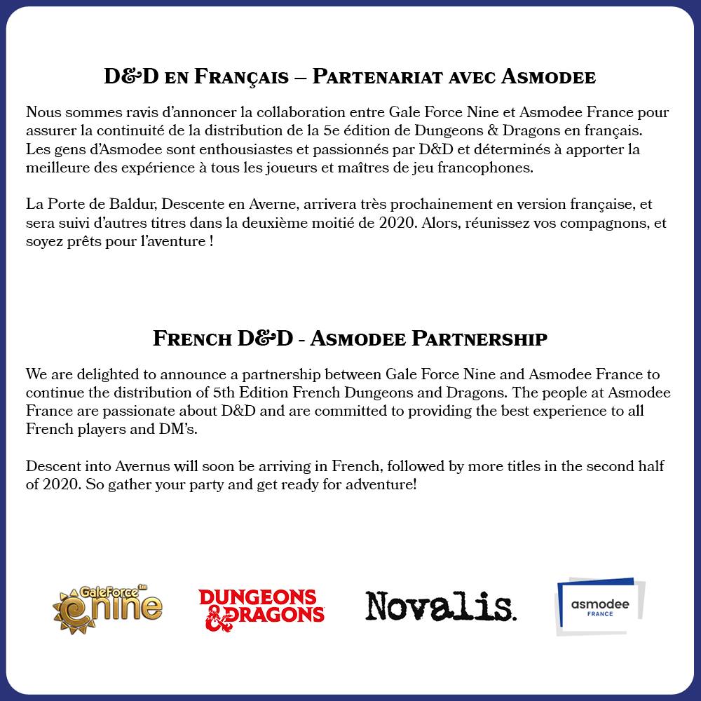 Gale Force Nine et Asmodee France collaborent pour la distribution de la 5eme édition de D&D