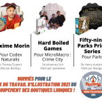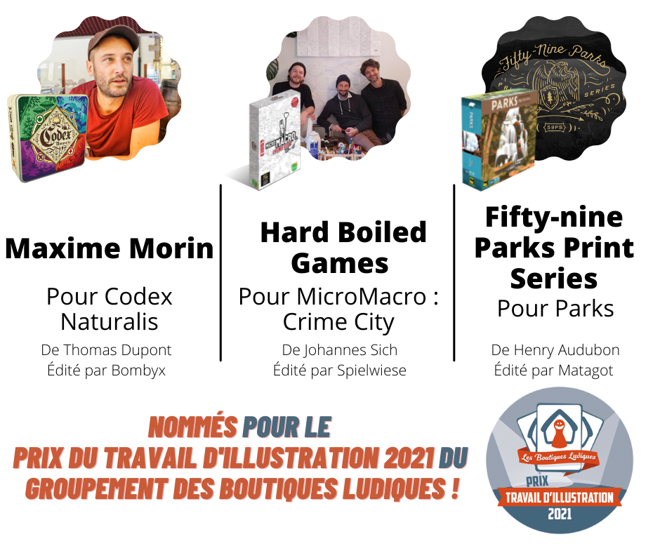Prix du Travail d’Illustration 2021 par le GBL – Groupement des Boutiques Ludiques : Codex Naturalis, MicroMacro et Parks (détails en description et sur le lien)