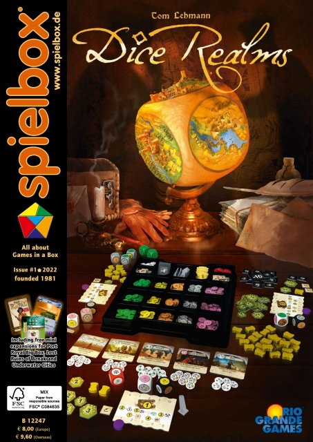Magazine Spielbox 2022/1: interview de Sébastien Pauchon et Tom Lehmann, review de Dice Realms / Golem / Messina…, goodies pour Port Royal, Narak et Underwater cities (magazine en anglais)