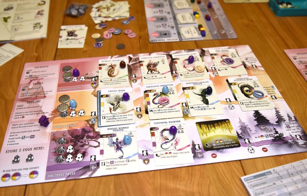 Jamey : L’un des aspects que j’aime le plus dans les plateaux de joueurs est que chacune des trois grottes a un avantage spécial à la fin que vous ne pouvez obtenir que si la grotte est entièrement creusée et entièrement occupée par des dragons. Cela vous met face à une décision difficile : Vous diversifier, en ajoutant quelques dragons à chaque grotte et en ne payant que le coût le plus bas pour explorer chaque grotte une fois par tour, ou vous spécialiser dans une grotte spécifique, en accumulant de multiples avantages et en vous donnant accès aux avantages d’exploration de fin de grotte.