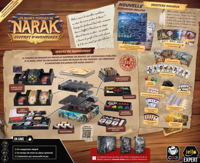 Les Ruines Perdues de Narak : Coffret d’Aventures est, en plus d’être une boite de rangement, une extension jouable de 1 à 4 joueurs dès 12 ans pour des parties de 120 minutes, édité par Iello.