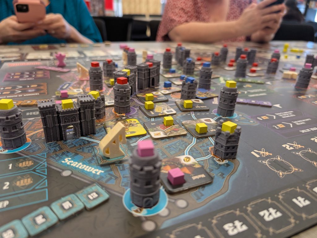 À mesure que vous construisez, vous placerez aussi vos cubes d’influence pour marquer votre contrôle. Certaines structures spéciales – donjons, portes et tours de guet – sont représentées par des miniatures dans lesquelles s’insèrent vos cubes, donnant littéralement vie à la ville en trois dimensions !