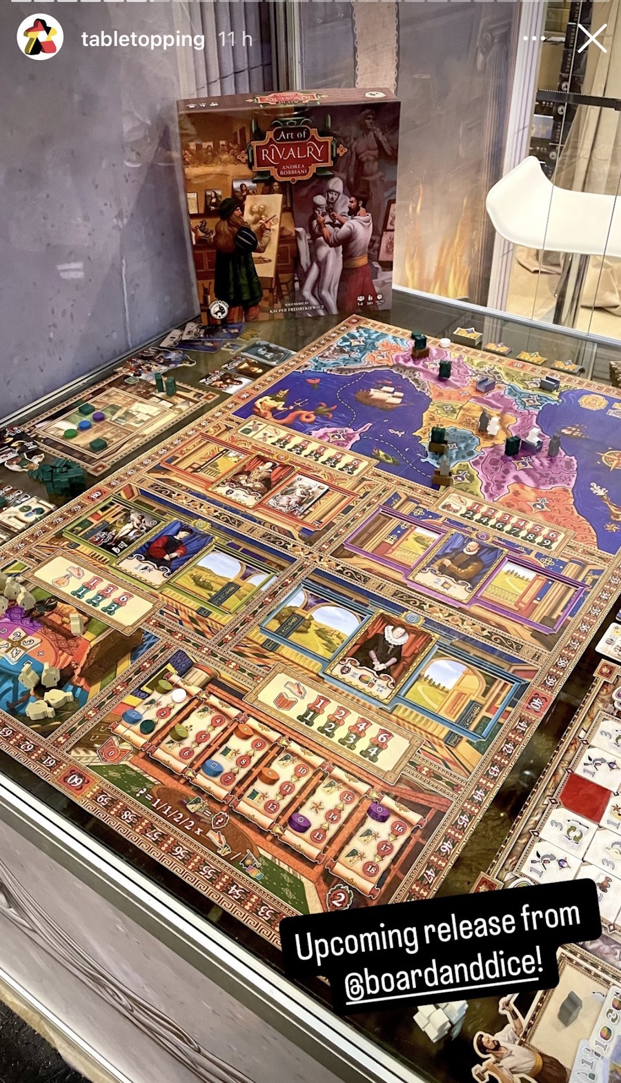 Art of Rivalry partagé par Tabletopping (que j’adore!) Peu d’informations trouvées sur le net mais je suis dessus ! (Art of Rivalry a fait ses débuts à Essen cette année, non jouable).