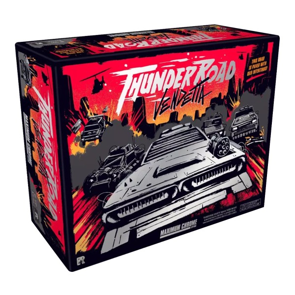 Test critique de Thunder Road : Vendetta (Lucky Duck Games, 2025), un jeu de course post apo où avant d’atteindre la ligne d’arrivée, il faudra réussir à détruire totalement un concurrent !