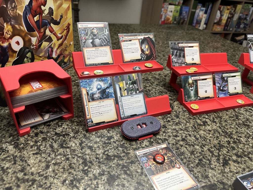 Dumah (qui a créé le modèle) en parle mieux que moi : « Mon objectif était d’obtenir un gain de place global, une grande visibilité et une facilité d’utilisation pour présenter les plans des méchants, tout en assurant que le tout tienne dans la boîte de base avec de la place pour 4 héros et quelques méchants, ainsi que toutes les jetons que j’utilise. Il y a un léger soulèvement de la boîte, comme je le montre sur une des photos, mais j’utilise des bandes pour maintenir le tout en place. Pour ceux qui découvrent le jeu, ceci N’EST PAS une solution pour ranger une collection, même si elle pourrait contenir toutes les cartes du jeu de base. Je voulais une boîte de jeu dans laquelle j’ai déjà constitué des decks et que je peux emporter pour une partie complète. J’utilise des jetons de type « burger » et des cadrans de points de vie imprimés en 3D, mais cela devrait fonctionner avec les jetons et cadrans d’origine. «