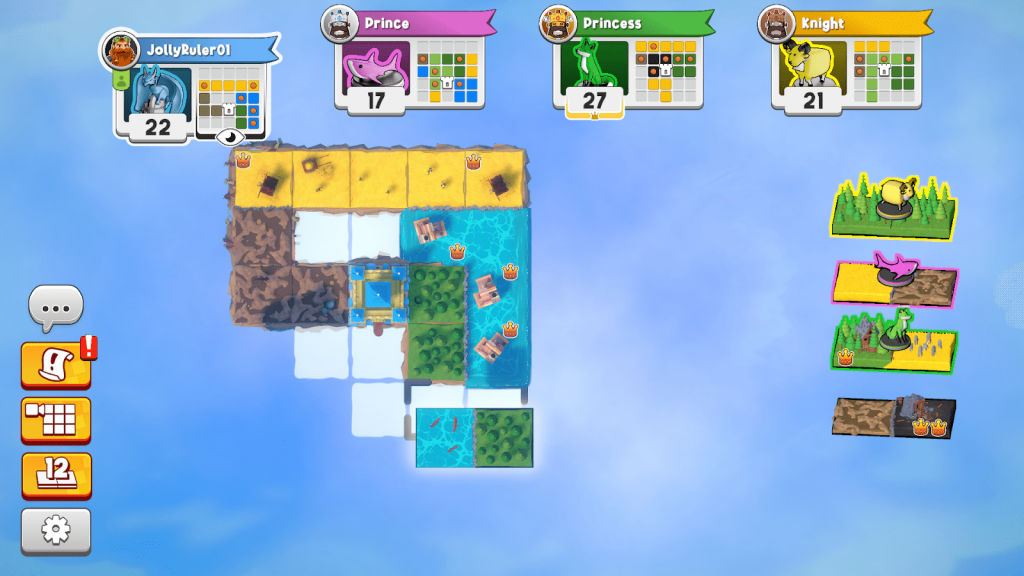 Une fois Kingdomino entièrement déconstruit, il était temps de passer à la partie passionnante : construire notre premier prototype jouable. Nous avons commencé par l’essentiel, les tuiles et les grilles, en nous concentrant sur ce qui semblerait naturel et satisfaisant sur un écran tactile. La solution ? Des mécanismes de glisser-déposer qui rendent le placement des tuiles tactile et gratifiant.