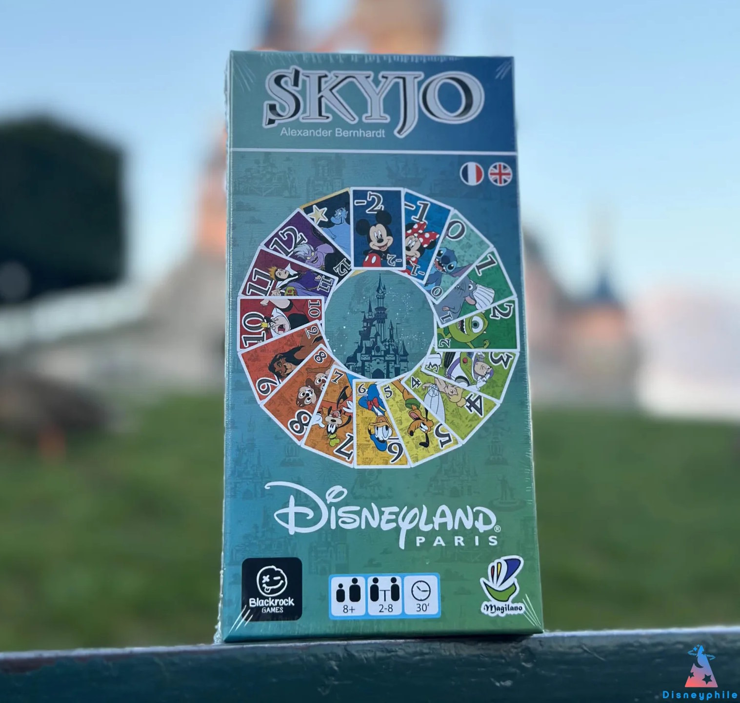 « Une variante inédite du jeu de cartes Skyjo, best-seller mondial édité par Blackrock Games, est disponible depuis le 13 décembre 2025 en exclusivité dans plusieurs boutiques de Disneyland Paris. Cette édition bilingue (français/anglais) revisite le classique avec des illustrations Disney, centrées sur le château et des personnages iconiques.