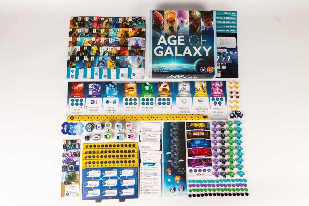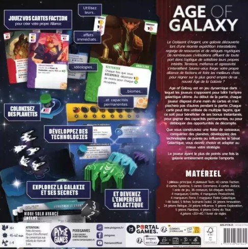 Age of Galaxy est un 4X dynamique dans lequel les joueurs s’opposent pour bâtir l’empire galactique ultime. Au début de la partie, chaque joueur dispose d’une main de cartes et n’en piochera plus ensuite. Chaque carte peut être utilisée de multiples façons : obtenir un bonus instantané, acquérir des capacités permanentes ou débloquer des opportunités de décompte. Que vous construisiez une flotte de vaisseaux, conquériez des planètes, développiez des technologies de pointe ou influenciez le Sénat Galactique, vous devrez choisir votre stratégie et l’adapter au mieux au cours de la partie.