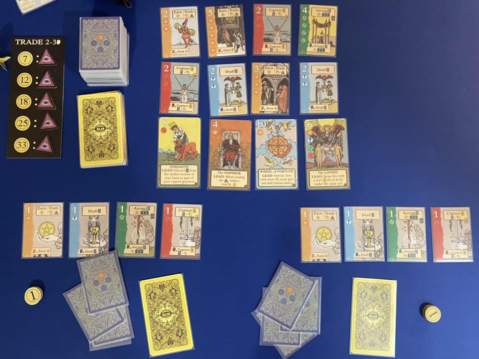 À votre tour, choisissez une action : gagner des pièces, piocher des cartes, monter en niveau ou capturer une carte de tarot. Les devins rivaux peuvent choisir de suivre votre action, mais si vous avez un niveau supérieur, ils doivent vous payer pour ce privilège.