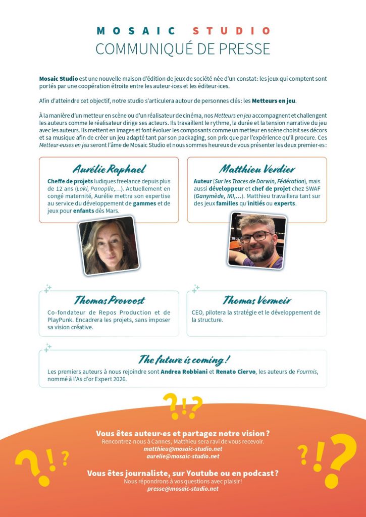 Mosaic Studio est une nouvelle maison d’édition de jeux de société née d’un constat : les jeux qui comptent sont portés par une coopération étroite entre les auteur·ices et les éditeur·ices.