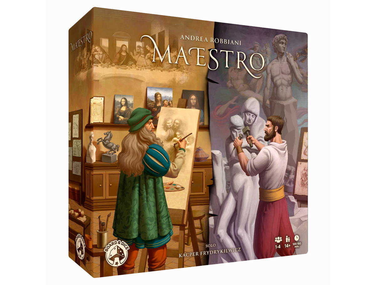 L’éditeur polonais Board & Dice prévoit de faire paraître Maestro en juin. Dans ce jeu créé par Andrea Robbiani (co-créateur de Fourmis), les ateliers de De Vinci et Michel-Ange sont en compétition pour attirer l’attention des riches et des puissants. Pendant le jeu, les deux ateliers (qui ont des capacités asymétriques) sont représentés par un seul joueur ou par une équipe de joueurs.