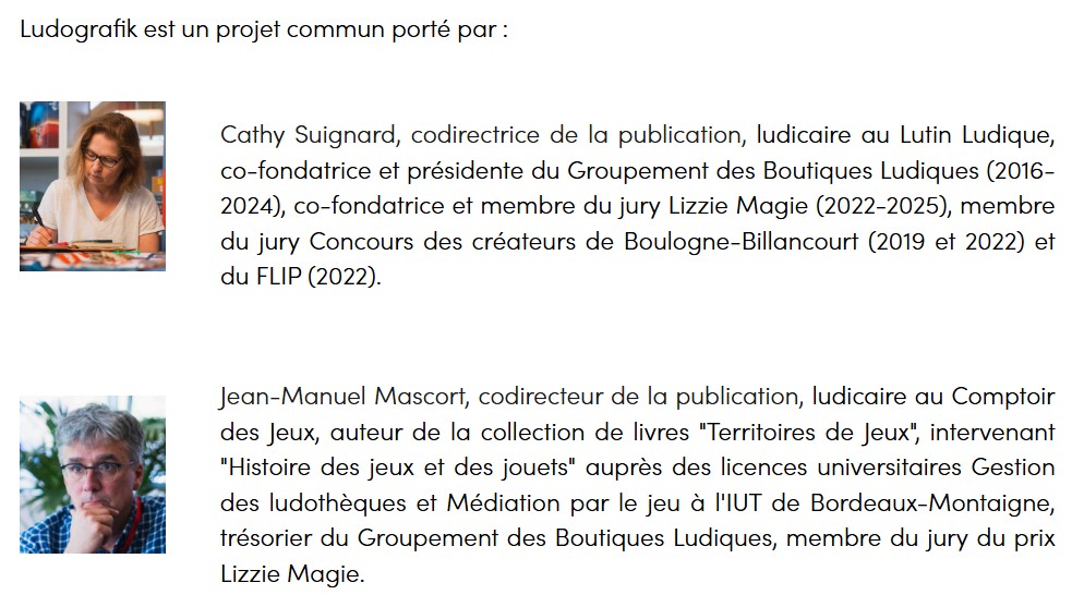 Cathy Suignard et Jean-Manuel Mascort, deux passionné.es et professionnel.les du monde du jeu de société ont décidé de créer une revue culturelle sur le jeu, inexistante à ce jour, abordant des thématiques variées : environnementale, sociétale, économique, politique, historique.