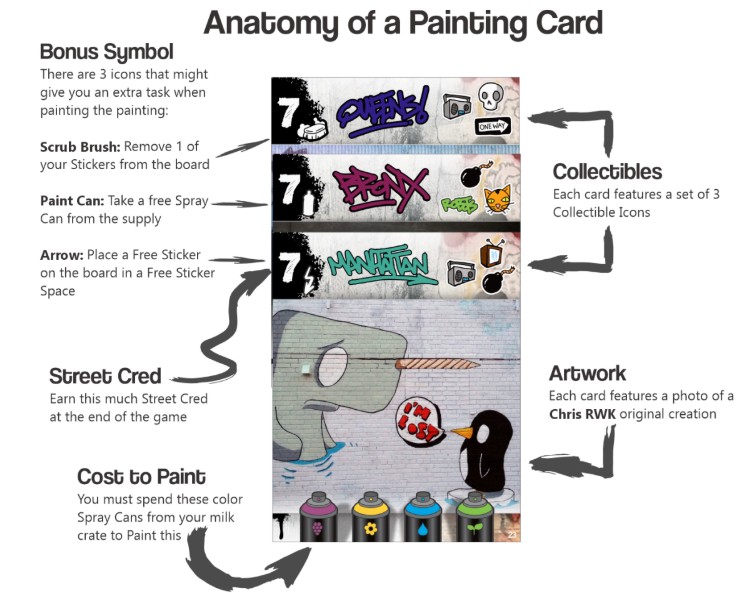 3. Une direction artistique percutante : Le plateau et les cartes respirent le street art. C’est coloré, dynamique et très immersif. Et c’est surtout Chris RWK qui est au pinceau (euh pardon à la bombe de peinture) 🙂