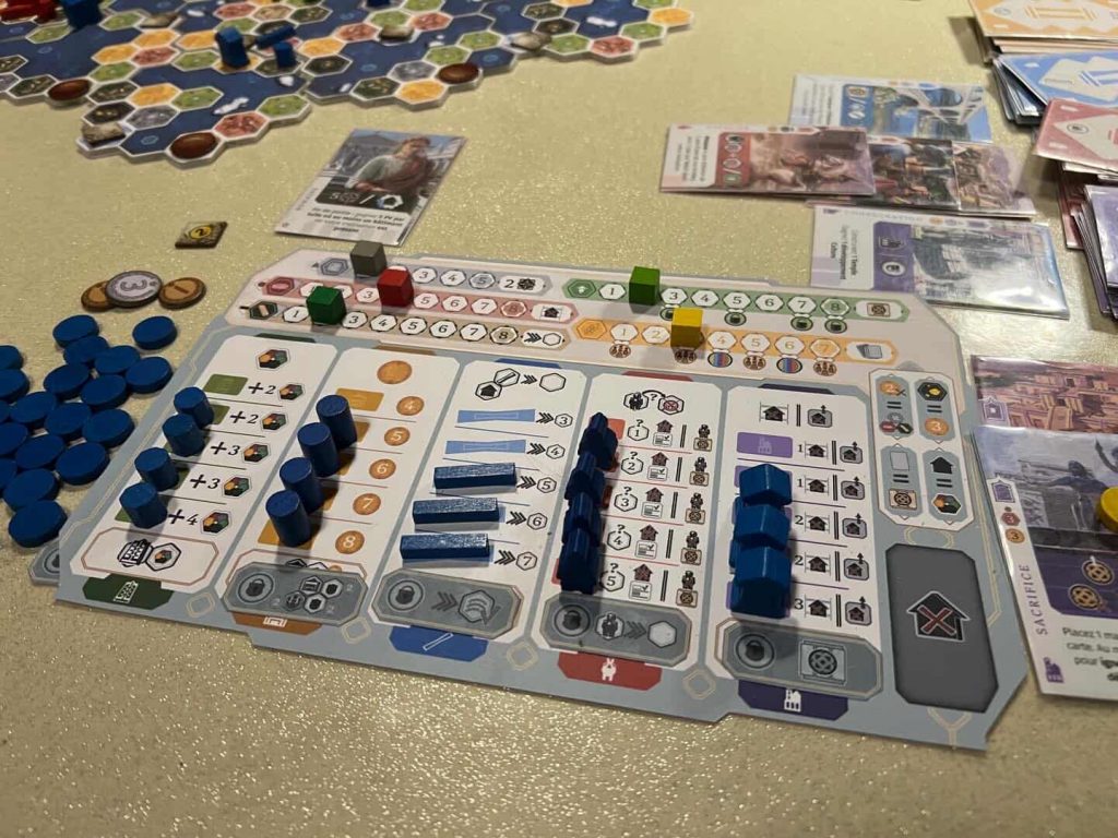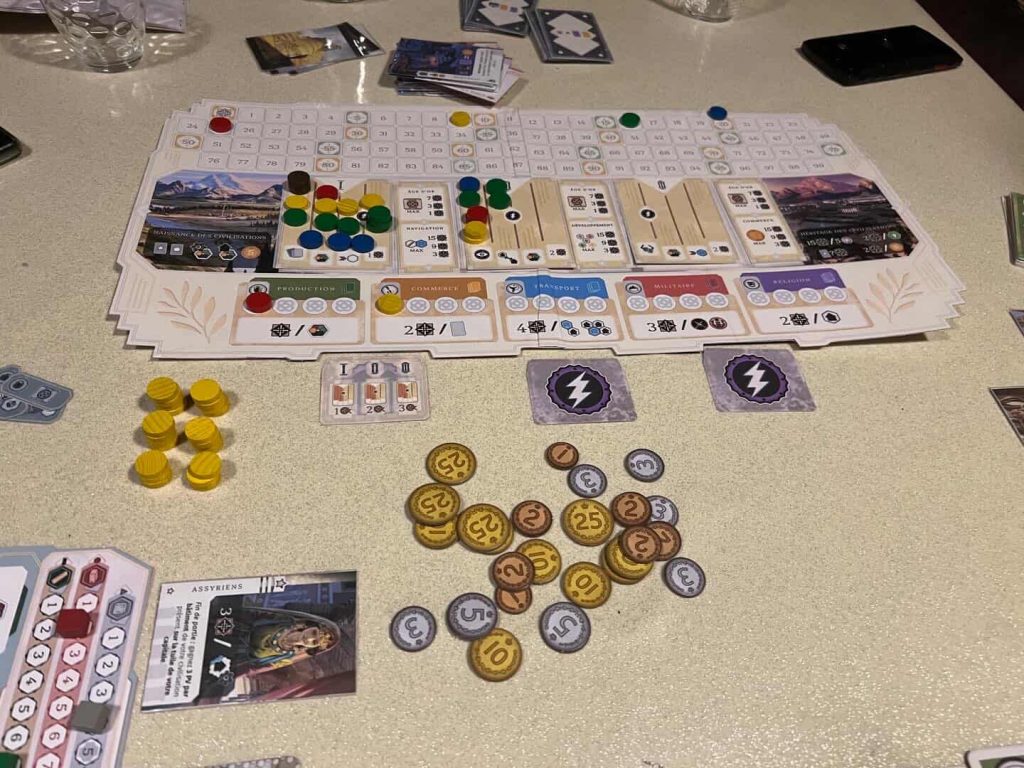 Jeu de civilisation dans lequel à son tour on joue 2 cartes : soit en payant pour son pouvoir, soit face cachée pour construire le bâtiment associé à la couleur de la carte.